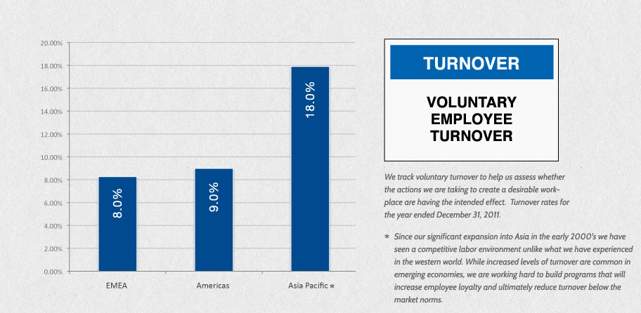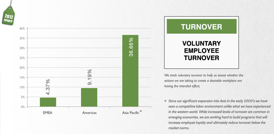 To help give our employees an unrivaled work experience, and to ensure that we are maximizing the potential of every employee in the company, we engaged in a number of development activities, including a stronger Organizational Talent Review, a company-sponsored Women's Leadership Alliance and a more prestigious and global President's Exceptional Value Award Program. Key to the success of our programs is an on-going effort to solicit feedback from employees to determine what is working well and where improvements are needed. An example of this is our Voice of the Employee Program (VOE) in the Americas.