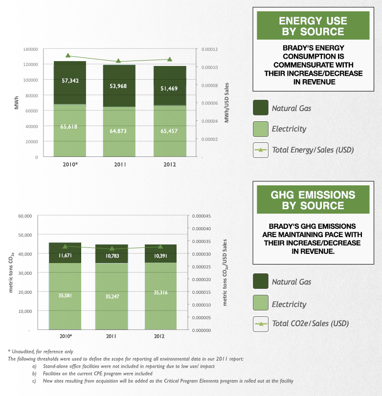 Brady's target is to decrease emissions of CO2 by 2%, normalized by sales, by 2017. In 2012, Brady's total energy consumption was 117,930 MWh which represents a 2% decrease. Brady's sales, however, also decreased in 2012 resulting in flat energy intensity (energy use/sales).