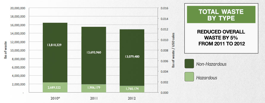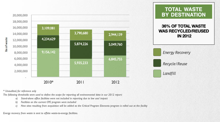 In 2012, Brady's total waste (hazardous and non-hazardous) globally was 14.8M lbs, a 5% decrease from 2011. We sent less waste to Energy Recovery (and therefore more to landfill) as waste energy producers limited our shipments due to low natural gas prices.