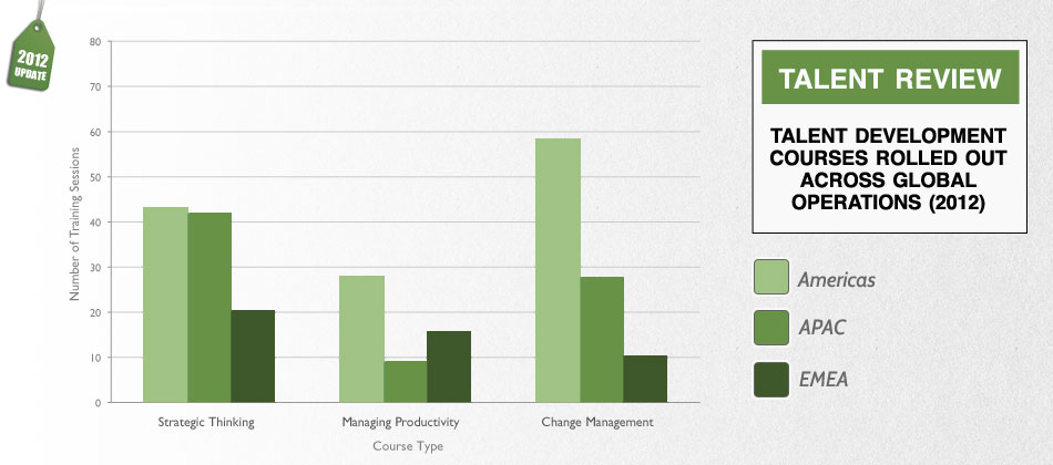 To complement this talent review and help develop leadership skills and the potential of our people, we instituted 3 new training courses in 2011, focusing on Strategic Thinking, Change Management and Managing Productivity. These were rolled out across our global operations in 237 training sessions representing 3834 total training hours.