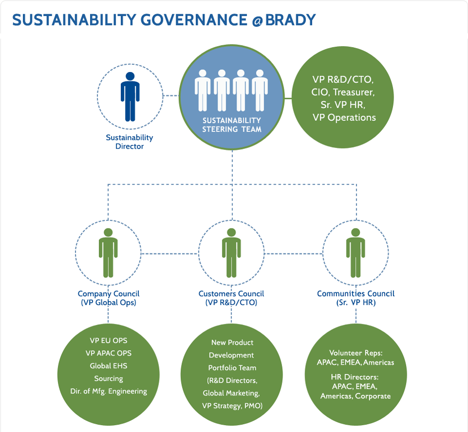 Brady’s Sustainability Steering Team was put in place to oversee the strategy and implementation of the program. To ensure that responsibility for managing and reporting on progress rests at the most senior levels in the business, the Steering Team includes several members of our Executive Team, including the Treasurer, Chief Technology Officer (CTO), Chief Information Officer (CIO), Senior Vice President of Human Resources and Vice President of Global Operations.